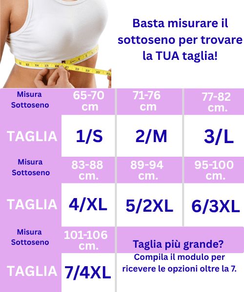 È semplicissimo! Ti basta misurare sotto il seno per sapere quale taglia corrisponde. Cliccando sul titolo sopra, trovi una tabella con le misure. Non serve conoscere la misura della coppa: il materiale e disegno unici si adattano perfettamente alla tua forma. Inoltre, le coppe sono anche removibili, per darti il volume e l’effetto push-up che desideri. Se ti serve assistenza, compila il modulo e la nostra incaricata ti aiuterà.